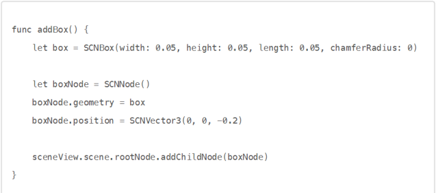 然后我们创建一个场景。这是要在视图中显示的SceneKit场景。然后我们将盒子节点添加到场景的根节点。场景中的根节点定义了由SceneKit呈现的现实世界的坐标系。