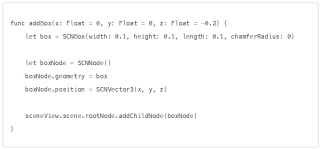我们基本上添加了初始化 addBox() 函数的参数。我们还给出了默认参数值。这意味着我们可以调用, addBox() 而不必像其中一样指定x,y和z坐标 viewDidLoad() 。