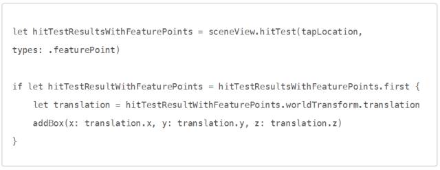 参数指定一个结果类型。该types参数要求命中测试搜索通过AR会话处理相机图像检测到的真实世界对像或曲面。结果类型有很多种类型。但是,我们将仅关注本教程中的特征。