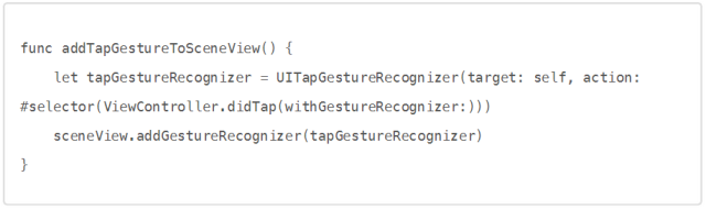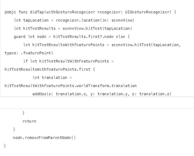 didTap(withGestureRecognizer:) 回调函数。然后我们将tap手势识别器添加到sceneView中。