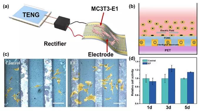 中国科学院北京纳米能源与系统研究所李舟课题组一直聚焦于TENG在生物医学领域的应用,2014年首次利用大鼠呼吸产生的电能驱动心脏起搏器(DOI: 10.1002/adma.201402064),2016年成功将心跳产生的机械能转化为电能,实现了自驱动的心率远程实时监控(DOI: 10.1021/acsnano.6b02693)。因此,基于上述设想与研究基础,李舟研究团队、中国医学科学院北京协和医院博士田静静与北京积水潭医院石锐研究团队三方合作,基于TENG的基本原理设计了一种自驱动电刺激器件,并采用前成骨细胞MC3T3-E1进行体外电刺激实验,通过体外实验证明所构建的自驱动电刺激器件能够促进成骨细胞的粘附、增殖和分化等过程,经过3小时的电刺激,细胞粘附率比对照组增加了72.76%,电刺激3天后,细胞增殖率提高了23.82%。另外,为了证明所设计的TENG能够成功收集生物体的微纳能源,研究人员将构建的柔性TENG植入老鼠的股骨表面,发现在老鼠腿部运动时能够成功驱动TENG输出电学信号,证明了该自驱动电刺激器件进行原位刺激的潜力,也为临床治疗骨折和骨移植后的骨重塑提供了新的研究方向。