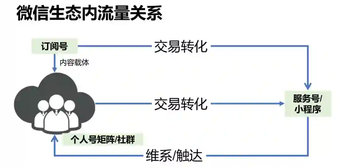 未来微信个人号矩阵与社群将承载订阅号内容传播,交易转化,用户维系,信息触达等环节中非常重要的一环。