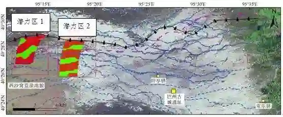 利用空间信息技术建立特征地物时-空关联分析模型与古人类遗迹预测模型,主动探测发现未知考古遗址。图为甘草、长亭两驿遗址空间分布潜力区考古预测位置图(底图为LS-7 TM 影像数据)。黑色实线代表汉长城遗址,蓝色虚线代表干古水系,品红色虚线代表考察路径
