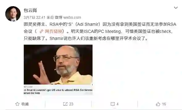 消息最先从中科院计算所先进计算机系统研究中心主任包云岗的微博上爆出,他还在微博上附上了相关的国外报道链接。他补充,自己的美国签证同样未能及时批下,因此只能缺席隔一天的计算机架构领域顶会 ISCA 。在微博最后,他强调了 Adi Shamir 在接受采访时说的一句话: