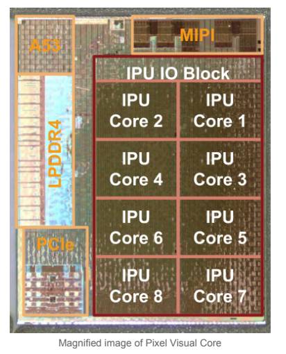 Pixel Visual Core 具有八个定制设计的图像处理单元(IPU)核心和 512 个算术逻辑单元,其中 IPU使用两种特定领域的语言:Halide 和 TensorFlow。前者用于图像处理,而后者则用于机器学习。