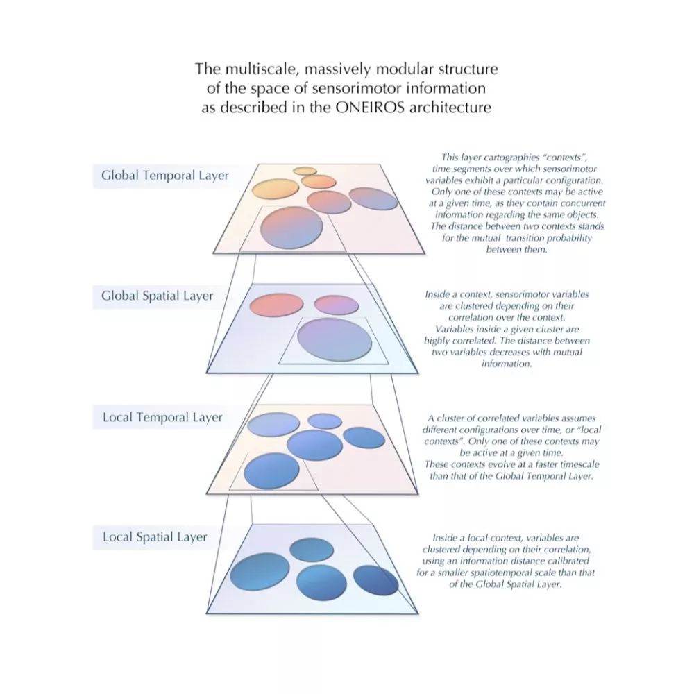 ONEIROS是从一个经典的RL思想开始的,集中于1)学习时空特征的模块化层次“maps”(使用PMI矩阵分解而不是梯度下降),2)通过注意力机制的形式进行上下文切换,以及3)内在动机(好奇心)。