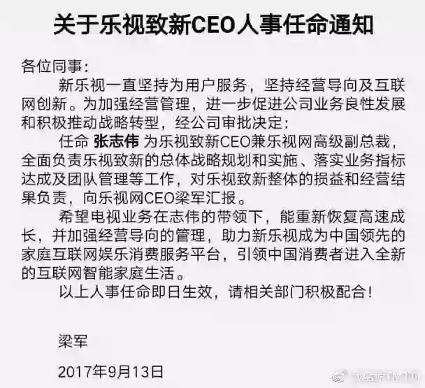 9月13日消息,乐视网今日发布人事任命通知,任命张志伟为乐视致新CEO兼乐视网高级副总裁,全面负责乐视致新的总体战略规划和实施、落实业务指标达成及团队管理等工作,对乐视致新整体的损益和经营结果负责,向乐视网CEO梁军汇报。