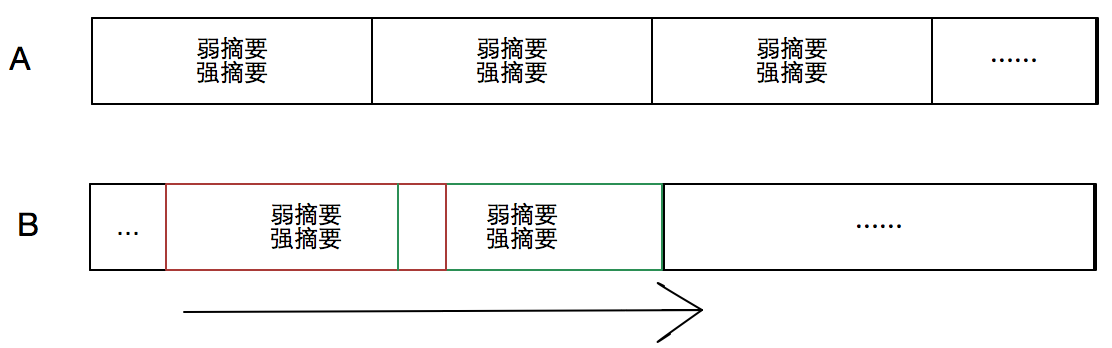 rsync增量传输算法是一种滑动块差异检测算法。以检测文件A和B的差异为例,首先对A按固定长度L划分为若干块,并对每一块生成弱摘要(Adler-32:速度快)和强摘要(MD5:鉴别度高),然后对B从第一个字节开始,以长度为L的滑动窗口,遍历整个文件,计算每个窗口块的弱、强摘要,并与A中的摘要值进行比较,弱、强摘要都相同者,即视为相同数据块,否即为差异块。如下图所示: