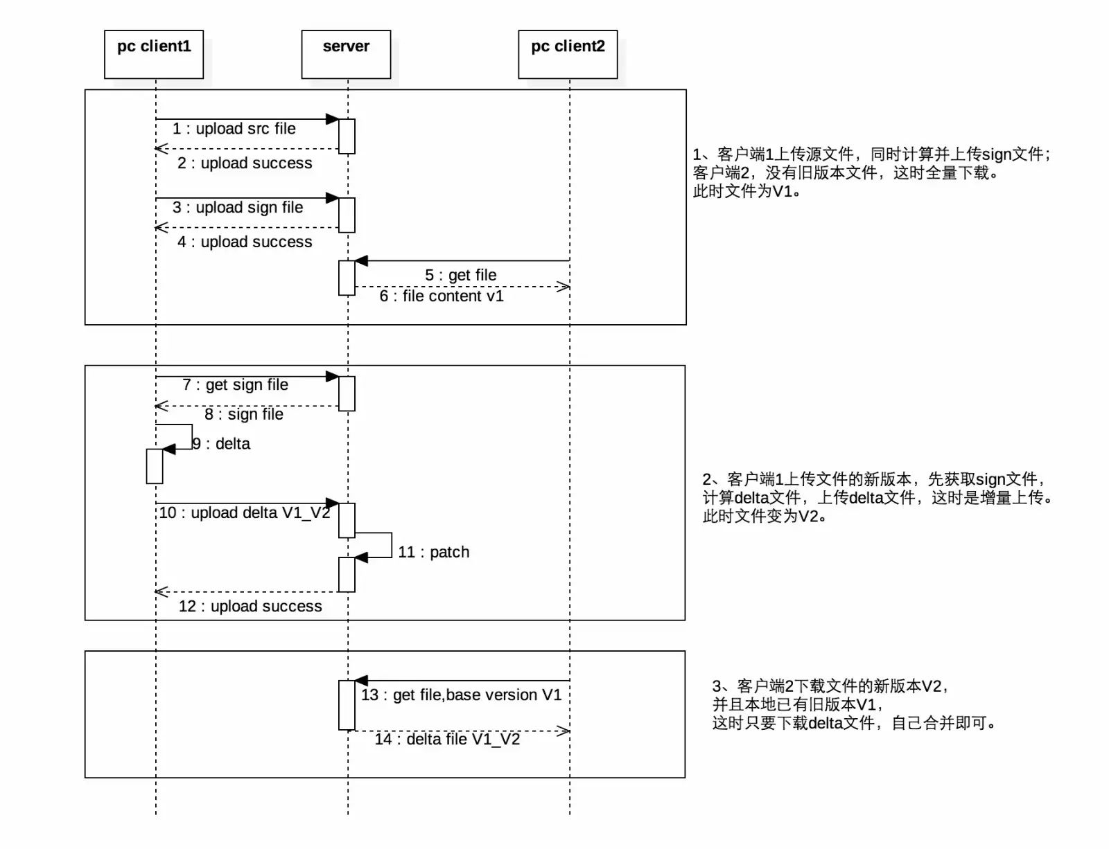 小结:同步的双方A、B基本是对等的,一方计算sign和合并文件,一方计算delta。 双方都有较大计算量,这在一个服务器多客户端场景下,服务端压力会过大。
