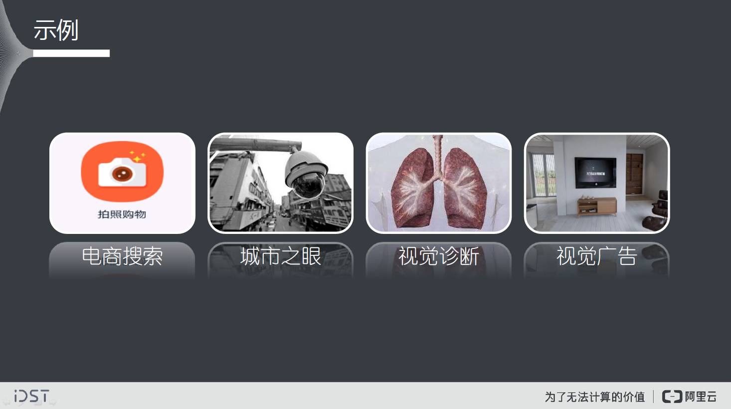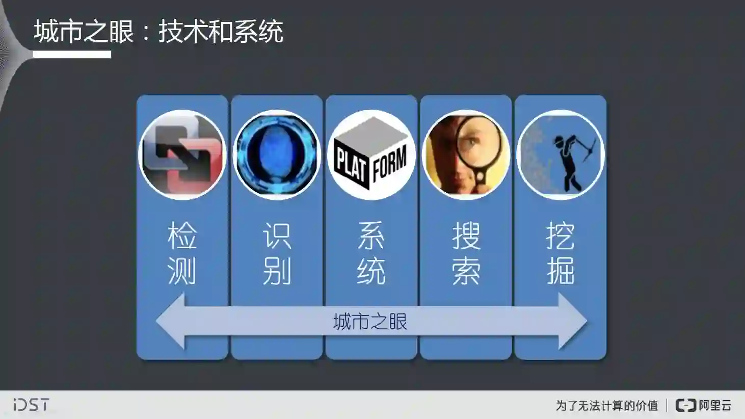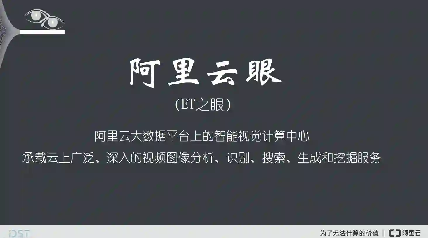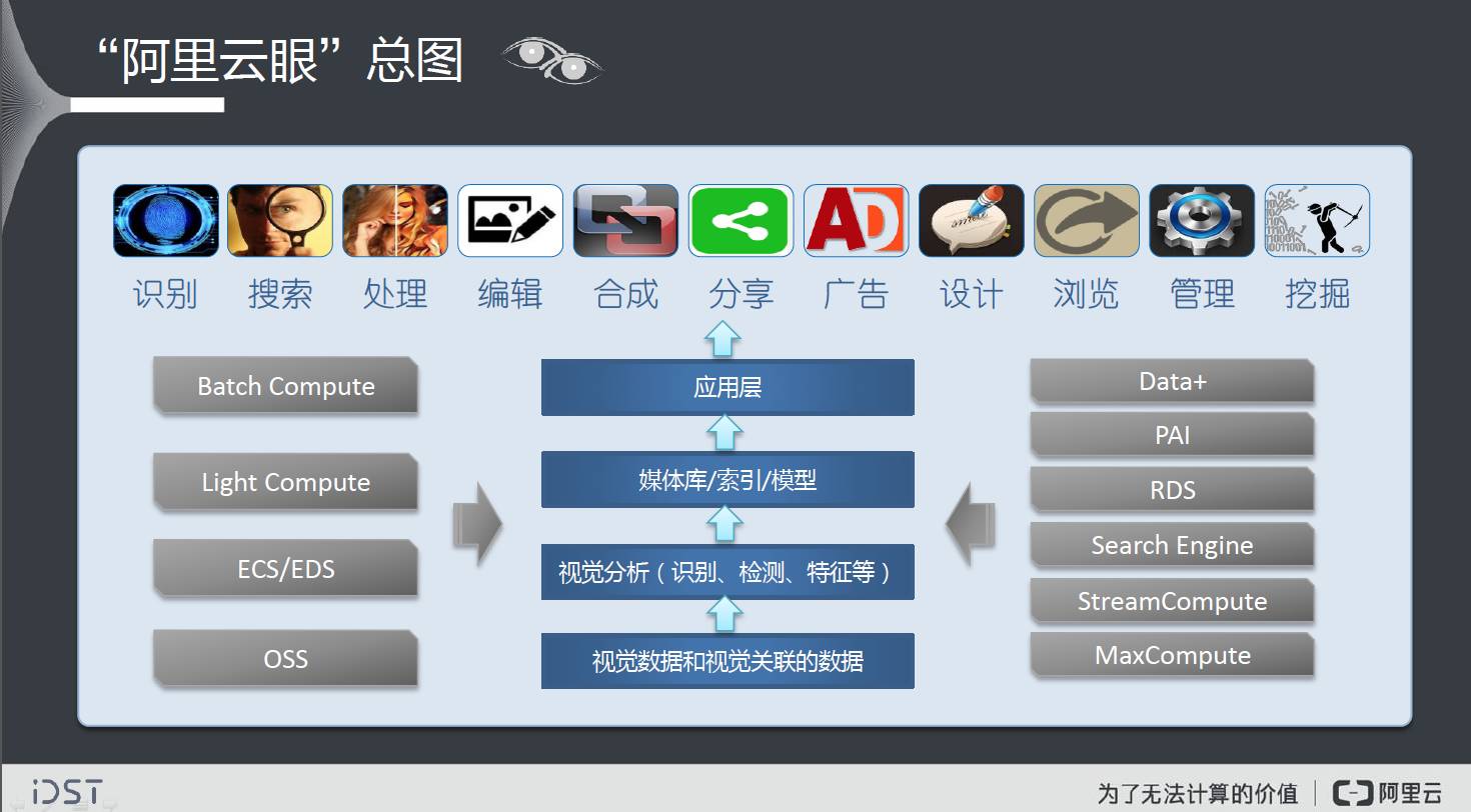 我们刚才提到的对视云上的视觉技术,其实阿里的视觉智能计算统一称为阿里云眼或ET之眼,是阿里大数据平台上的智能数据计算中心,承载云上广泛深入的视频图像分析、识别、搜索、生成和挖掘服务。