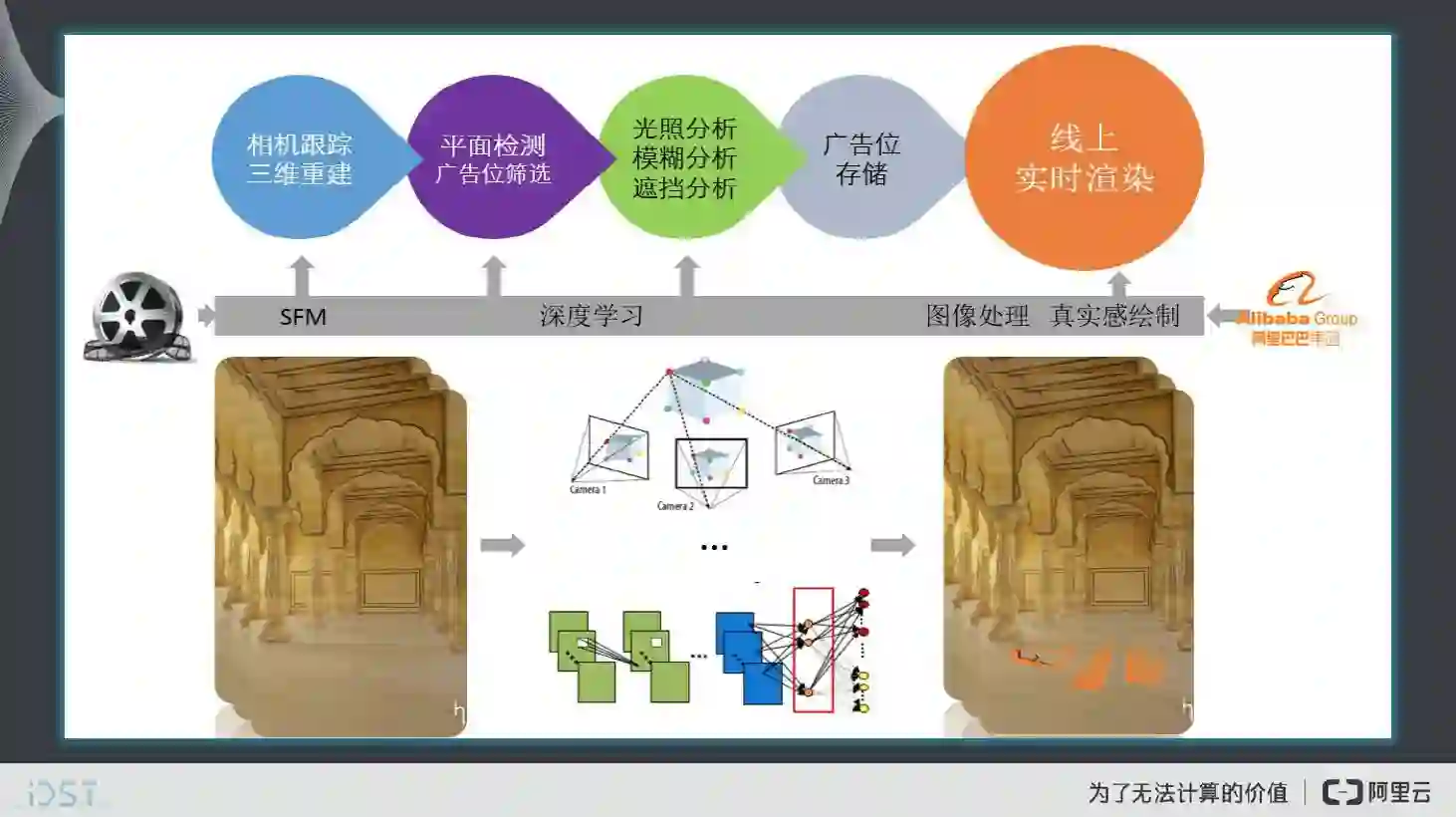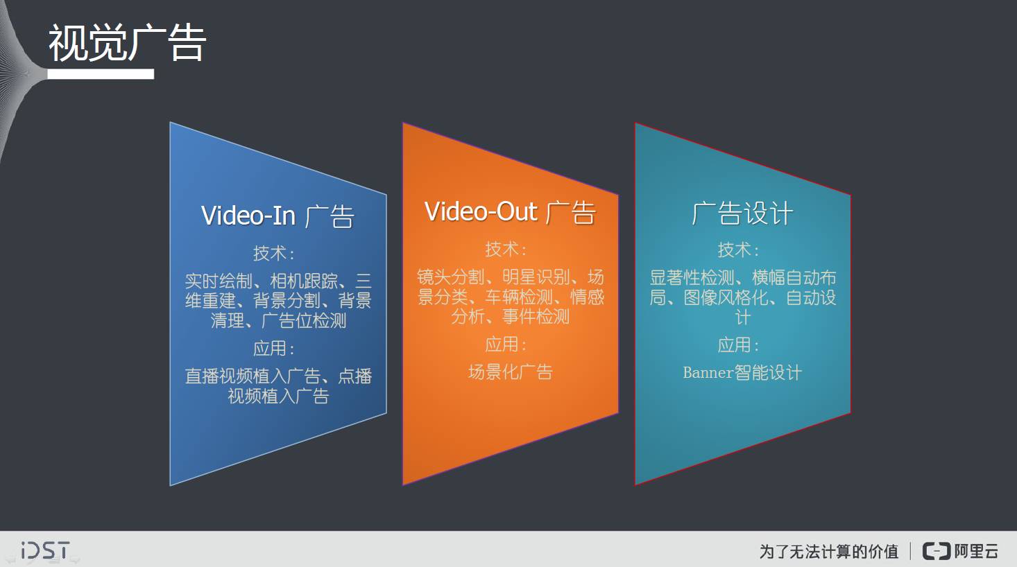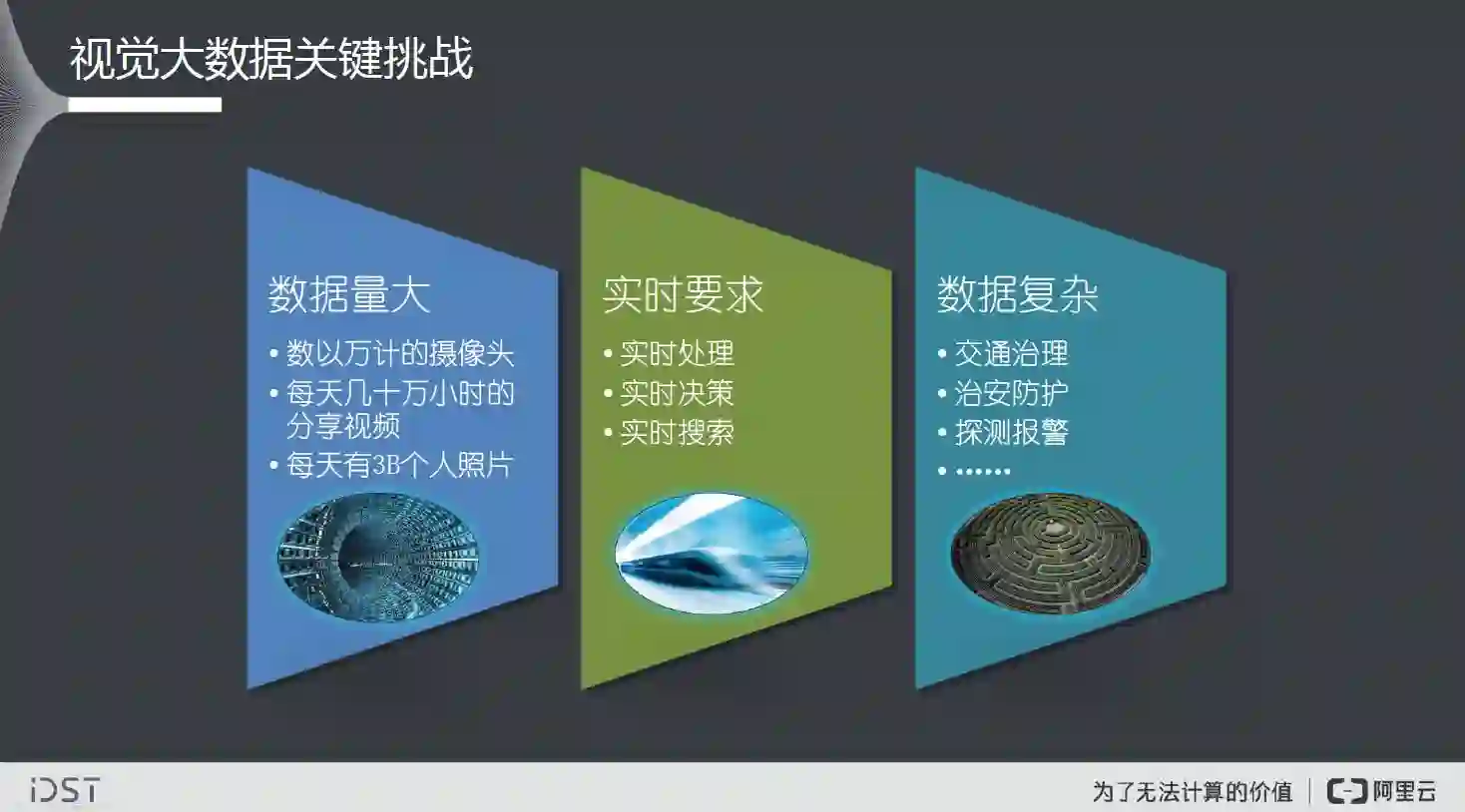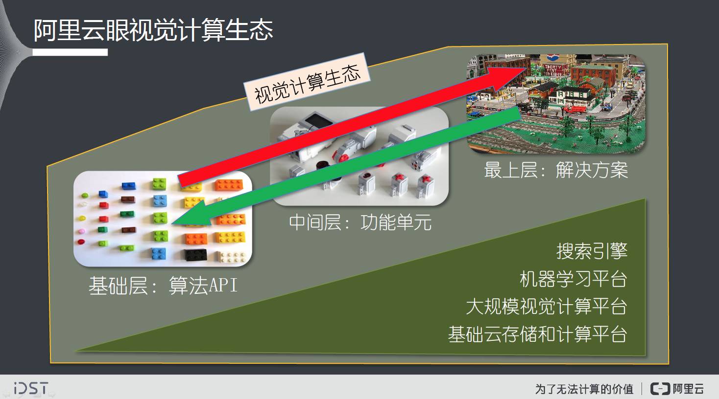 我们刚才提到的对视云上的视觉技术,其实阿里的视觉智能计算统一称为阿里云眼或ET之眼,是阿里大数据平台上的智能数据计算中心,承载云上广泛深入的视频图像分析、识别、搜索、生成和挖掘服务。