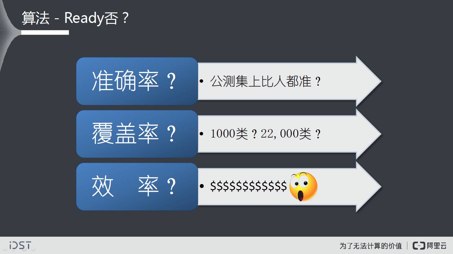 我们大概看一下现在的算法、数据、平台、商业等角度是不是真正ready了。首先,我们看算法。提到算法,一般大家首先关心的是算法的准确率。经常有人说公测集上的准确率已经超过人的能力。其实,刷数据集的人都知道这仅是个开始,我们要面对的世界比公测集要残酷得多。