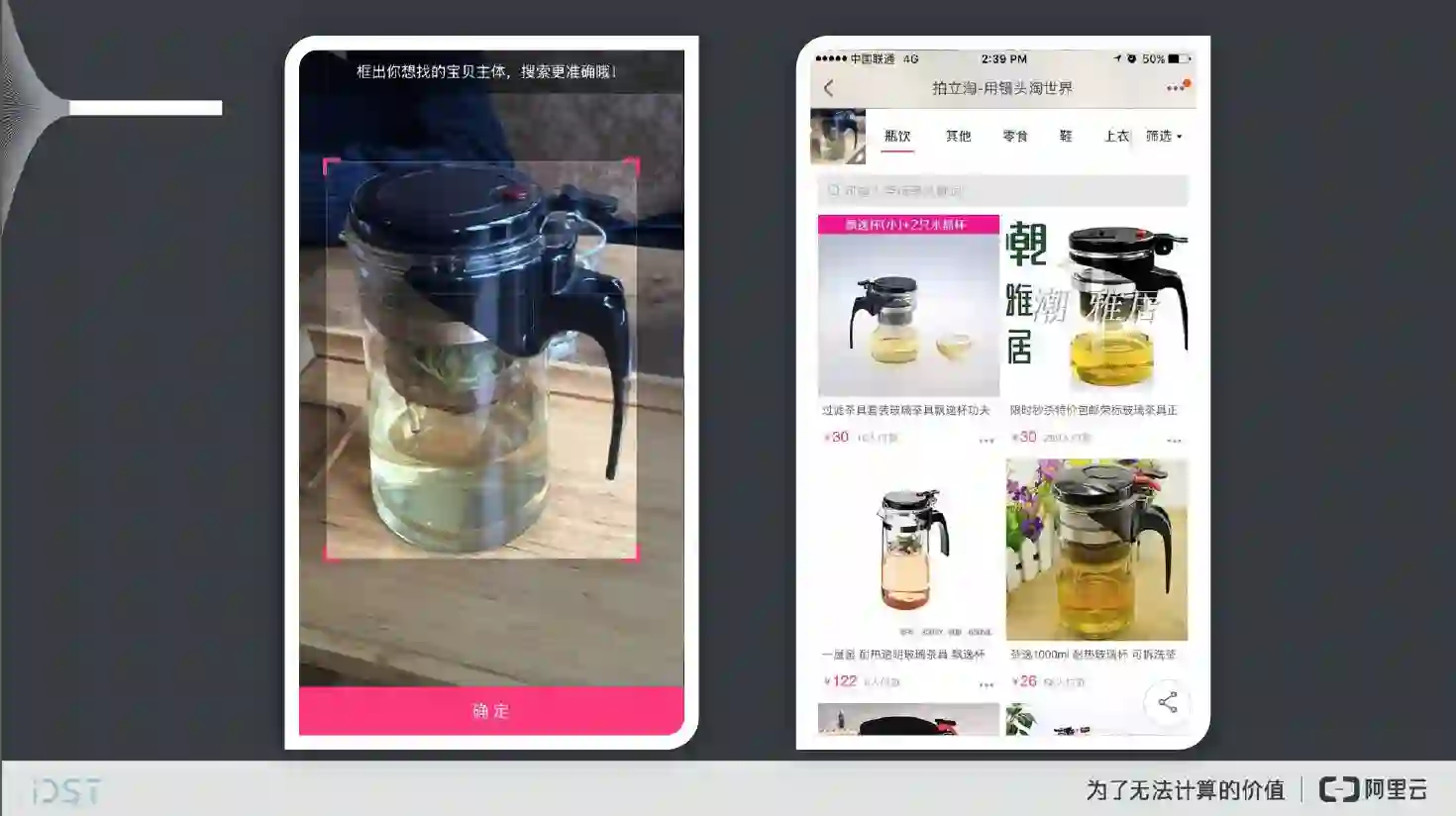 我们来看一些例子,比如,当看到杂志里比较有意思的商品,可以直接拍照,看看淘宝上有没有卖,包括鞋子、衣服等。这是一个杯子,记得上次跟同事一起喝茶,看到泡茶的杯子很不错,之后再拍立淘上一看就知道它叫飘逸杯。