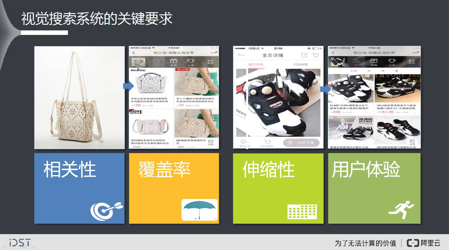 算法的覆盖率更是经常被人忽略。其实,覆盖率往往决定产品是不是真的可用,比如电商领域的视觉搜索,用户对搜索的期望很高,他希望拍什么都能搜到满意的结果,若覆盖率不够,用户就会用脚投票了。还有算法的计算效率,尤其在处理大量视觉数据时,效率能够决定这个事情有没有发生的可能性。