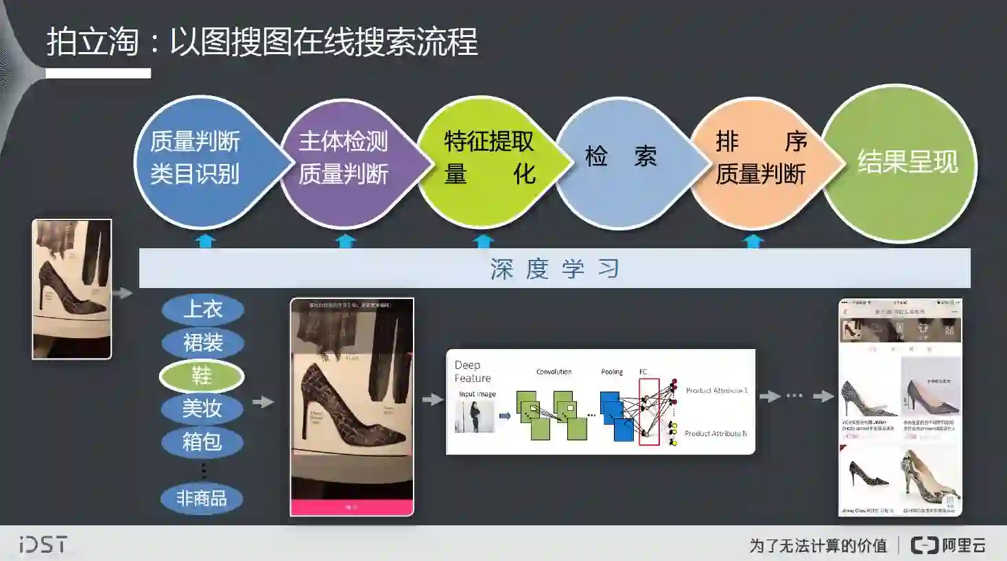 这是以图搜图的在线搜索流程,首先有图片质量判断和类目识别,第二是主体检测和进一步的主题质量判断,第三是特征提取和量化,第四是检索,第五是排序和搜索结果质量判断,最后是结果呈现,反馈给最终的用户。在整个链路中,深度学习贯穿始终。