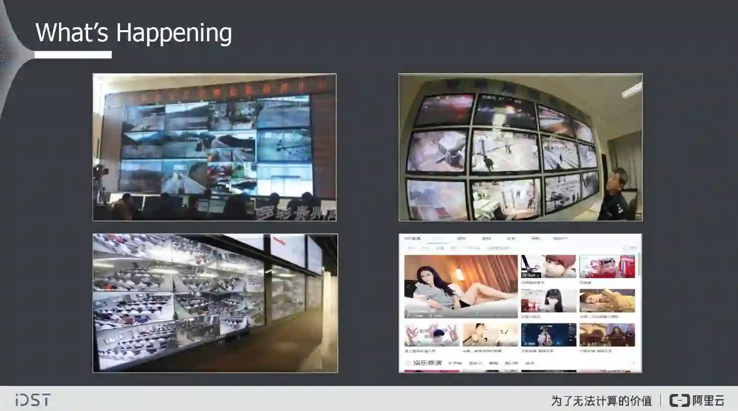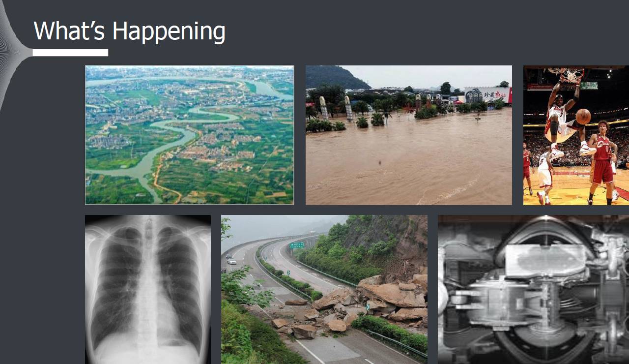 首先,我们看看现在发生了什么。这些其实已经发生很多年了,这里有大量的道路的,安全的,教育的,卫星的,无人机的,互联网的,手机拍照的图像视频数据。前面几个我们是被动拍摄的,后面几个是主动拍摄的。