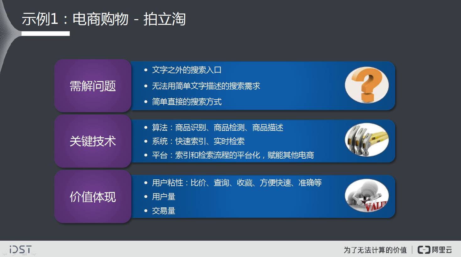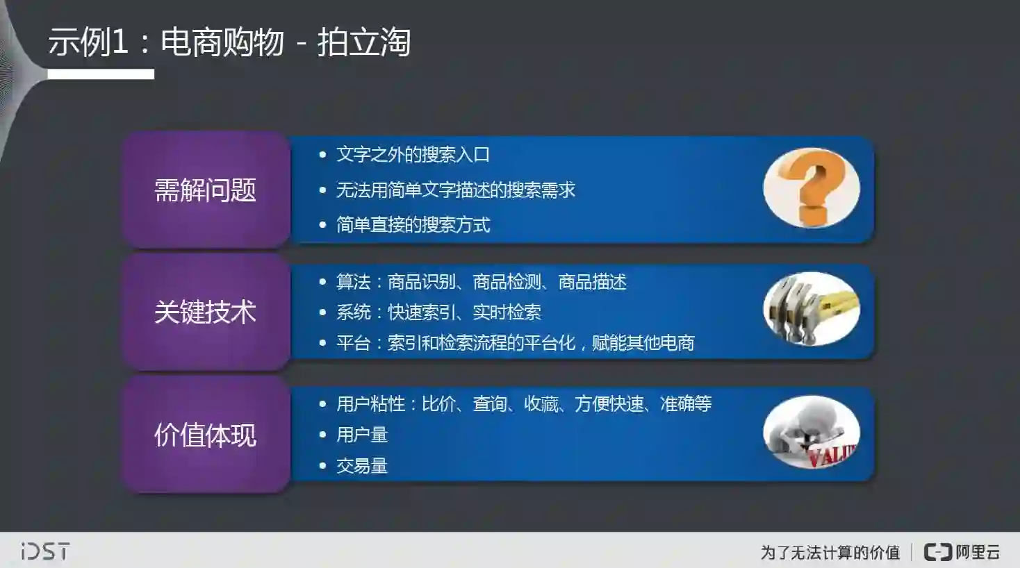 从价值角度,用户量和交易量就可以反映出来。如果一个商品的拍照搜索能有千万级的用户,每天有几千万的成交,影响力还是很大的。