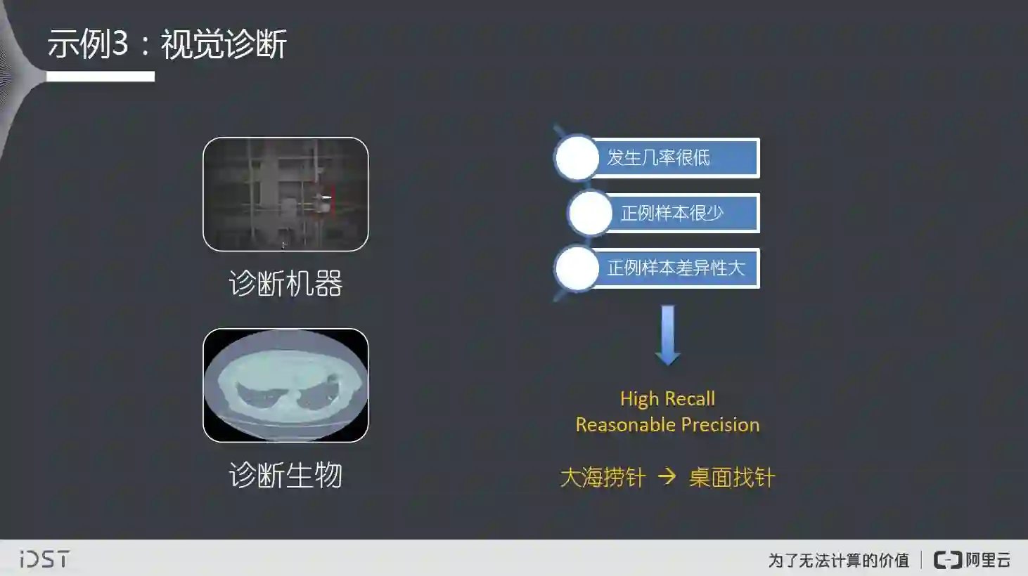 第三个例子是视觉诊断,包括诊断机械(工业上)还是生物诊断(医疗上)。这与刚才提到的时空异常有一定的相关性,共同的特点是目标样本很少,目标样本之间的差异很大。这与通常的检测识别不同,这里我们需要做到的是 high recall 和 reasonable precision。这就是我们提到的从“大海捞针”到“桌面找针”,可以节约大量人力。