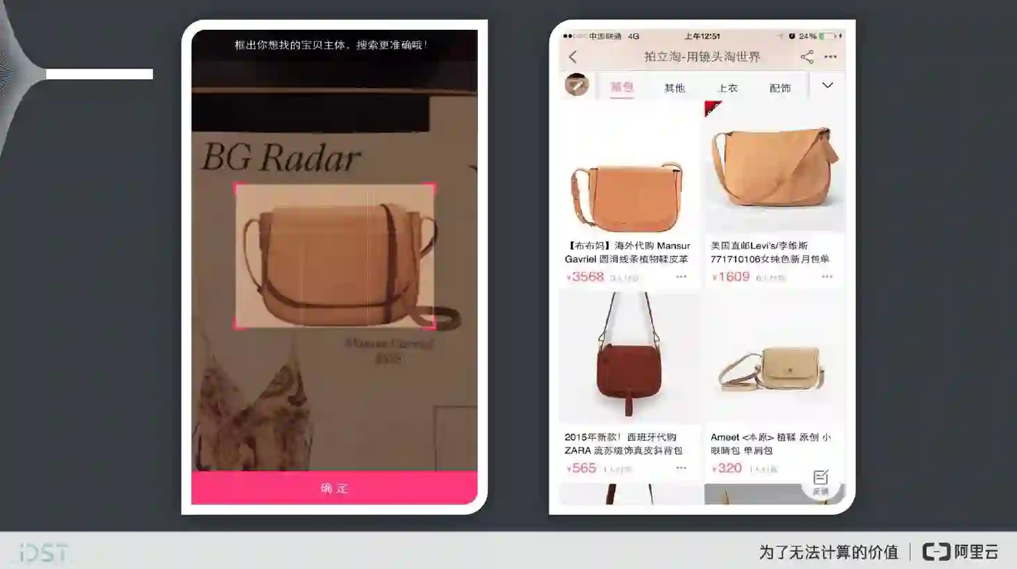 下面举几个例子,这是阿里巴巴,阿里云上的一些技术,有些已经成熟,有些正在做。第一个例子是电商的搜索。电商的图像搜索(通过拍照的方式进行商品搜索)解决的是文字之外的搜索入口问题。其实图像搜索的历史很悠久,商品搜索应该是最容易落地的,最有价值的场景。我们经常会碰到无法用简单的文字描述的搜索需求,电商中的图像搜索就是解决这个问题的。