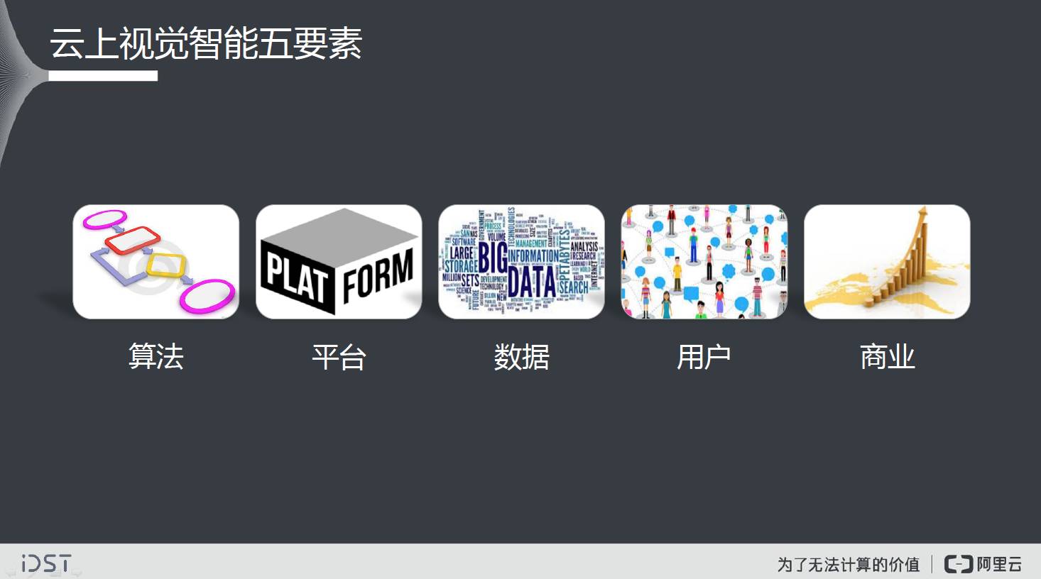 总结起来,这就是视觉智能的五要素——算法、平台、数据、用户和商业。算法是安身立命之本;平台和效率决定这件事是否能够发生;数据一方面是利器,一方面也是束缚;用户决定了你做的事情是不是正确的事情;如果没有很好的商业模式,这一切都是无法长久的。