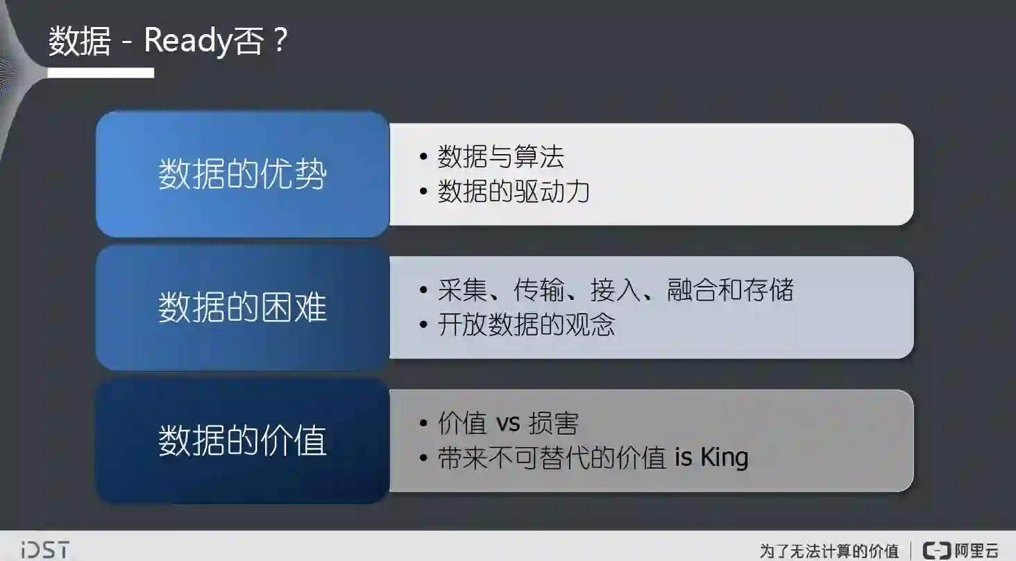 还有数据,我们经常发现,数据对算法性能的提升要超过算法本身的优化。我们经常看到大量的数据,可是对于有些场景(后面会提到),真正能够用来做算法研发的数据很少,它被埋藏在大量的其他数据当中。另一方面,大量的各种数据的利用确实还有很多困难,从技术来讲有采集、传输、接入、融合和存储等等的困难,以及整个数据链路的打通;当然还有非技术的困难,比如数据的开放,数据拥有者是不是愿意开放这些数据,比如涉及隐私的探头数据。其实在中国数据开放的条件远远比西方好,这也是AI在中国为什么能够遍地开花、部分结果的一个重要原因。