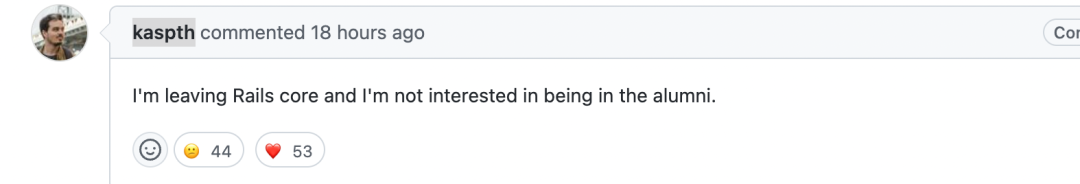 巧合的是,就在这篇文章发布后不久,Javan Makhmali(Rails Committer团队的成员)、Kasper Timm Hansen(Rails核心团队开发者)以及Andrew White纷纷宣布离职。