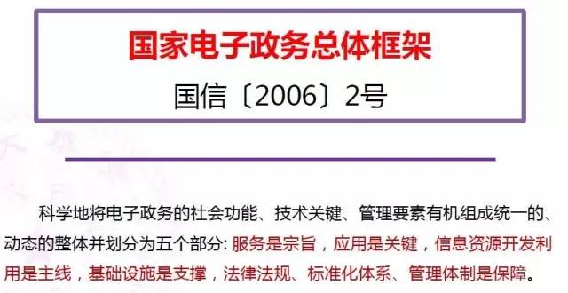 第二个重要文件是在2006年,由国家信息化办公室的国信2号文,这个文件专门对电子政务的总体框架做了一个基本的描述,然后作为国家文件的形式固定下来。