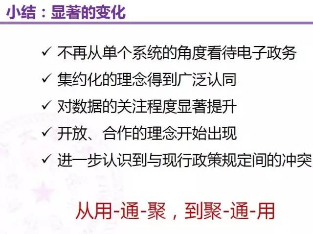 简单地总结一下,实际上一轮的电子政务顶层设计不再是从单一系统的角度来看电子政务的设计,而是更多地强调集约化的理念,而且这种理念已经在我们搞新信息化的行业领域,甚至我们政府已经有广泛的认可,无非就是怎么样把它体现在政府架构里面。另外包括数据,大数据时代数据成为资产,成为关注的焦点,所以数据的架构体系是里面最核心的内容。另外开放合作的理念开始显现,一方面有专门的数据开放平台,还有我们通过互联网企业的平台能够让政府的办理嵌入到里面去,提供一个更有用户黏性,或者用户体验更好的服务。另外尽量和现行的政策之间减少冲突。