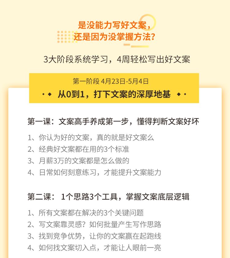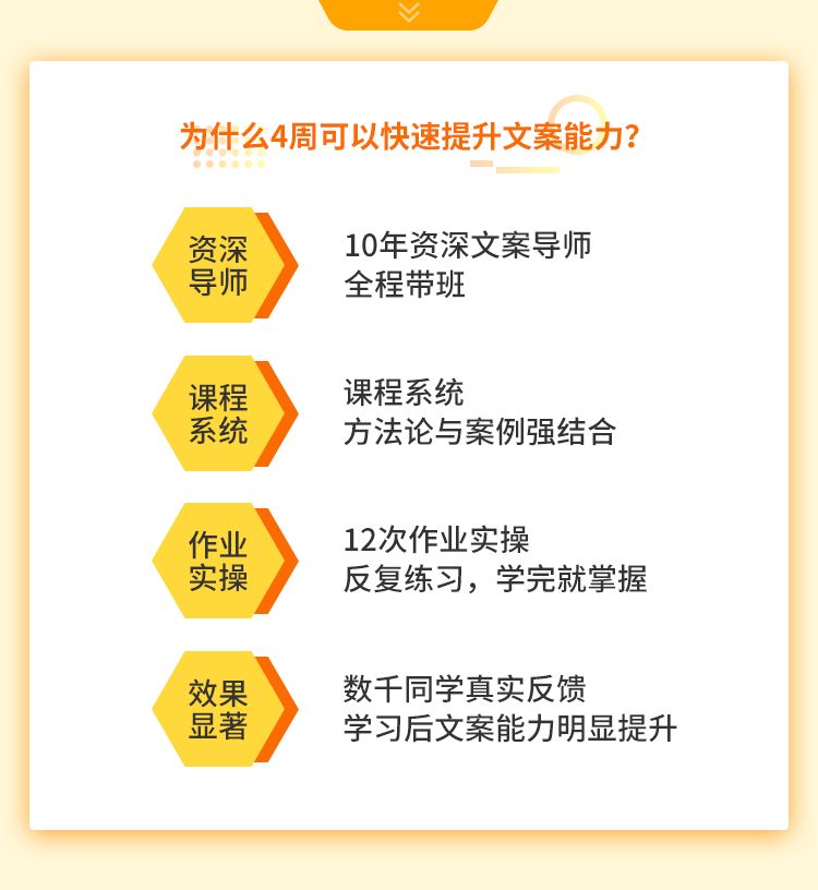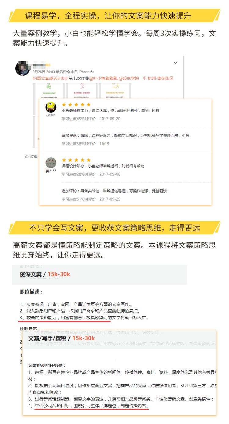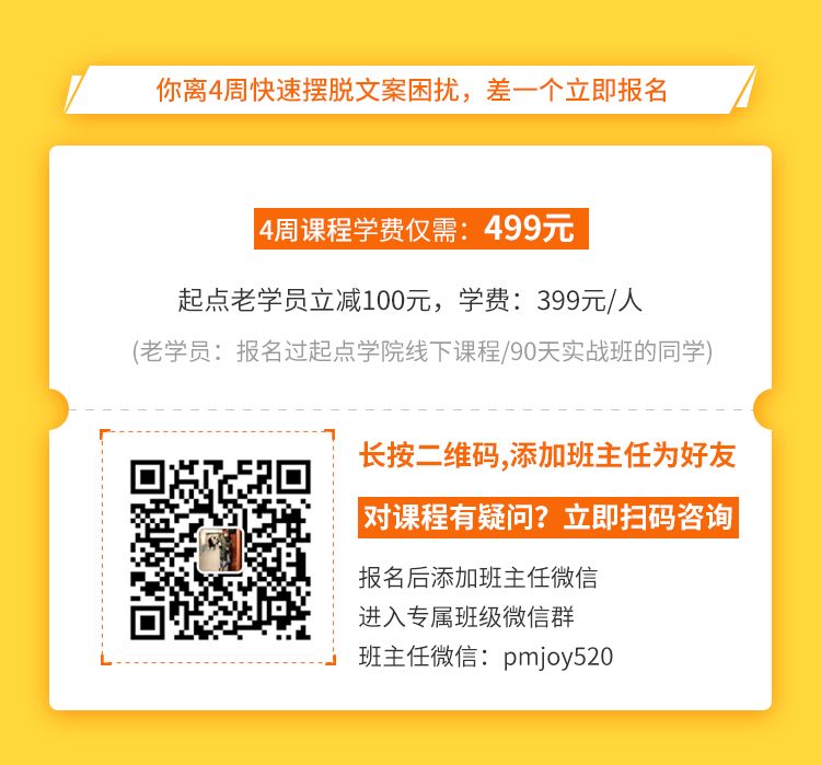 “起点学院&腾讯课堂”联合打造文案训练营,通过4周的系统学习, 11次文案实操,老师的1对1批改和班级群内答疑。