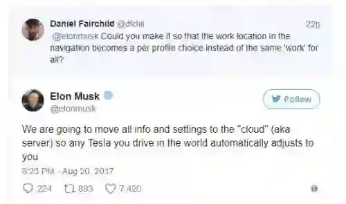 据国外网站teslarati报道,特斯拉CEO马斯克推特透露,特斯拉公司计划通过共享网络在云端保存驾驶员信息。马斯克正在车上开发这项功能,无论是特斯拉的拥有者,特许经营者还是网络乘客都可在特斯拉官方APP中分享自己的驾驶习惯,特斯拉可根据这些数据将座位,侧视镜,方向盘等设备自动调整到司机习惯的角度和方式。