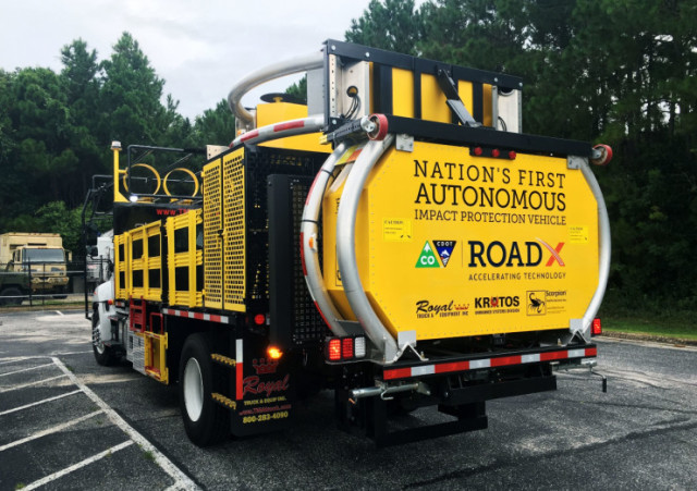 美国科罗拉多州将自动驾驶技术应用在防撞缓冲车上,Royal Truck and Equipment公司负责车辆整体构架,Kratos Defense公司负责将相关的自动驾驶技术集成到车上。该自动驾驶防撞缓冲车可以通过电脑,经由制动器和电控线缆实现方向盘和制动踏板的控制。工作人员可在紧急情况下关停这辆车。防撞缓冲车是指“屁股”后面装置缓冲垫的卡车,通常用于保护在公路上施工的人员的安全。