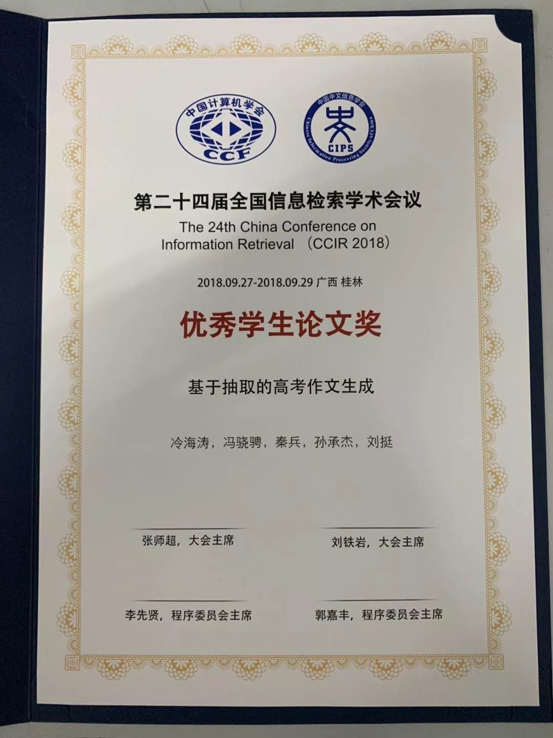 其中,《基于抽取的高考作文生成》获得了本次大会的优秀学生论文奖。