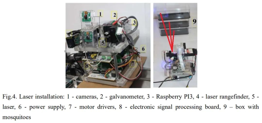 1:摄像头;2:电流计;3:Raspberry Pi 3;4:激光测距仪;5:激光器;6:电源;7:马达驱动器;8:电子信号处理板;9:装蚊子的盒子。
