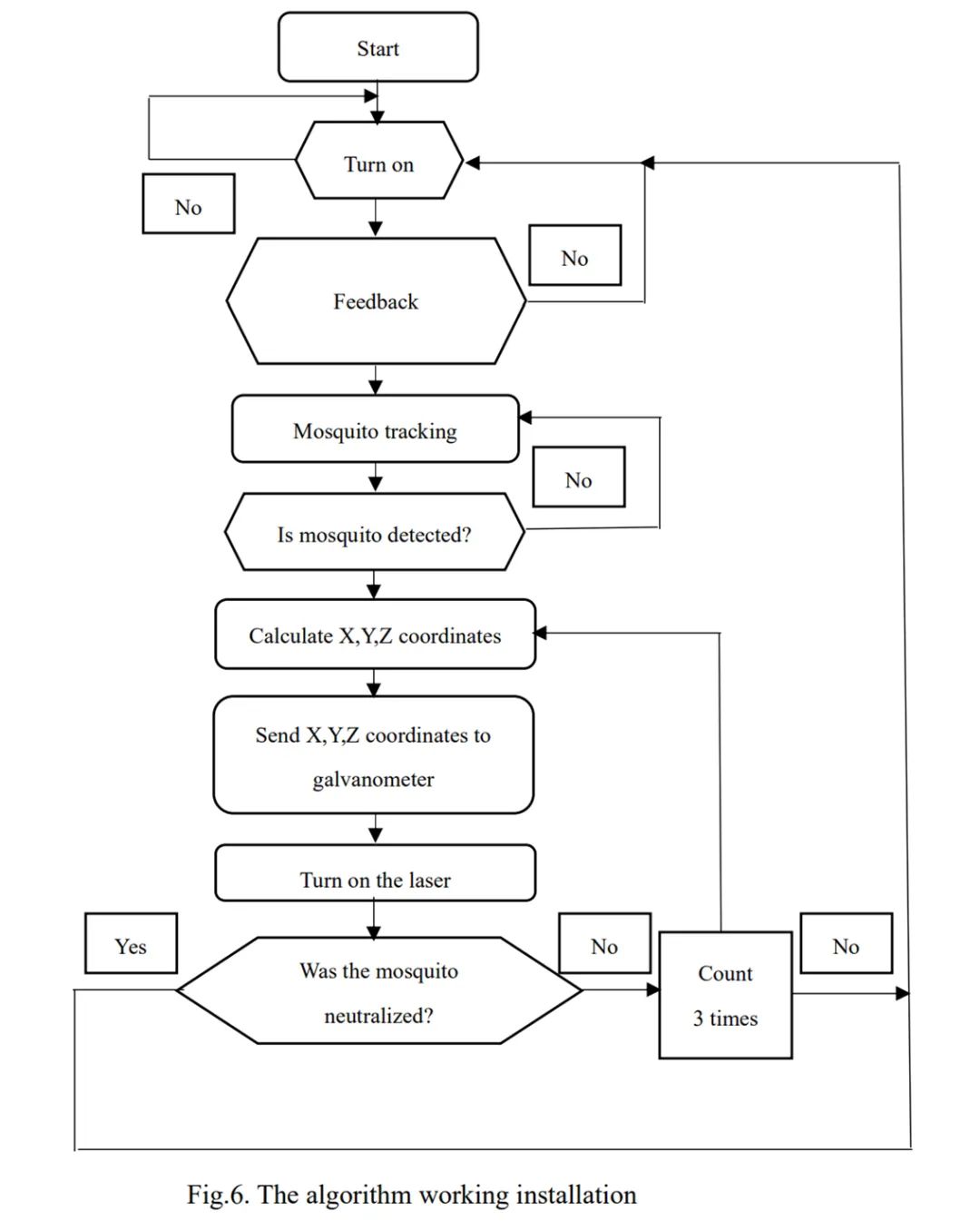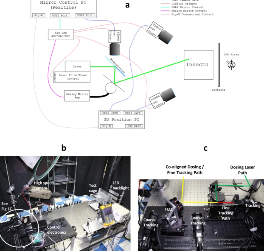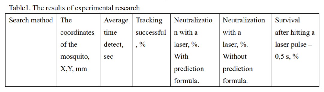 这一激光灭蚊系统的工作流程如下图所示。首先,利用摄像头及系统内置的算法确定蚊子的位置并算出它的坐标,然后将这一坐标传递给电流计。在发射之前,电流计可以借助镜子来改变激光的方向,从而瞄准蚊子。在激光发出之后,如果蚊子被打中,系统将开始新一轮的工作,如果没有,系统将重新计算蚊子的坐标并进行再次打击。考虑到蚊子的运动轨迹比较多变,研究者还分析了影响蚊子飞行的各种因素(比如气味、风速等),并列出了一个预测蚊子轨迹的公式。