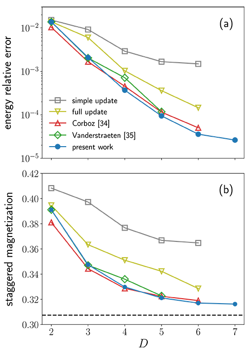 图一 (a)不同方法计算二维自旋1/2反铁磁海森堡模型基态能量的相对误差的比较;(b) 不同方法计算交错磁化强度的比较。