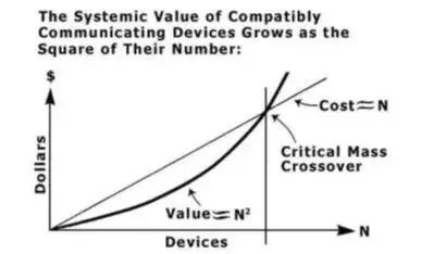 他想通过这张简单图清楚地说服客户——买网卡的成本随着时间是线性增长的(N),但网卡构成的网络价值则是呈指数级增长的(N²)。