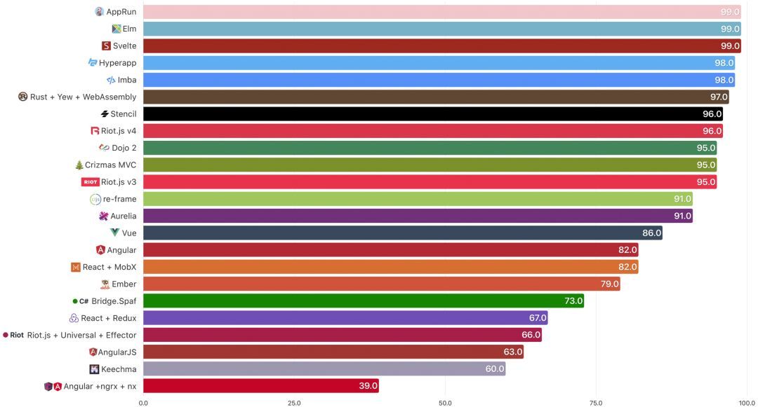 Lighthouse Audit 不会说谎。你可以看到在今年未维护 / 未更新的框架做出来的应用跌破 90 分大关。如果你的应用得分超过 90,表现应该不会有太大区别。具体来说,AppRun、Elm 和 Svelte 确实令人印象深刻。
