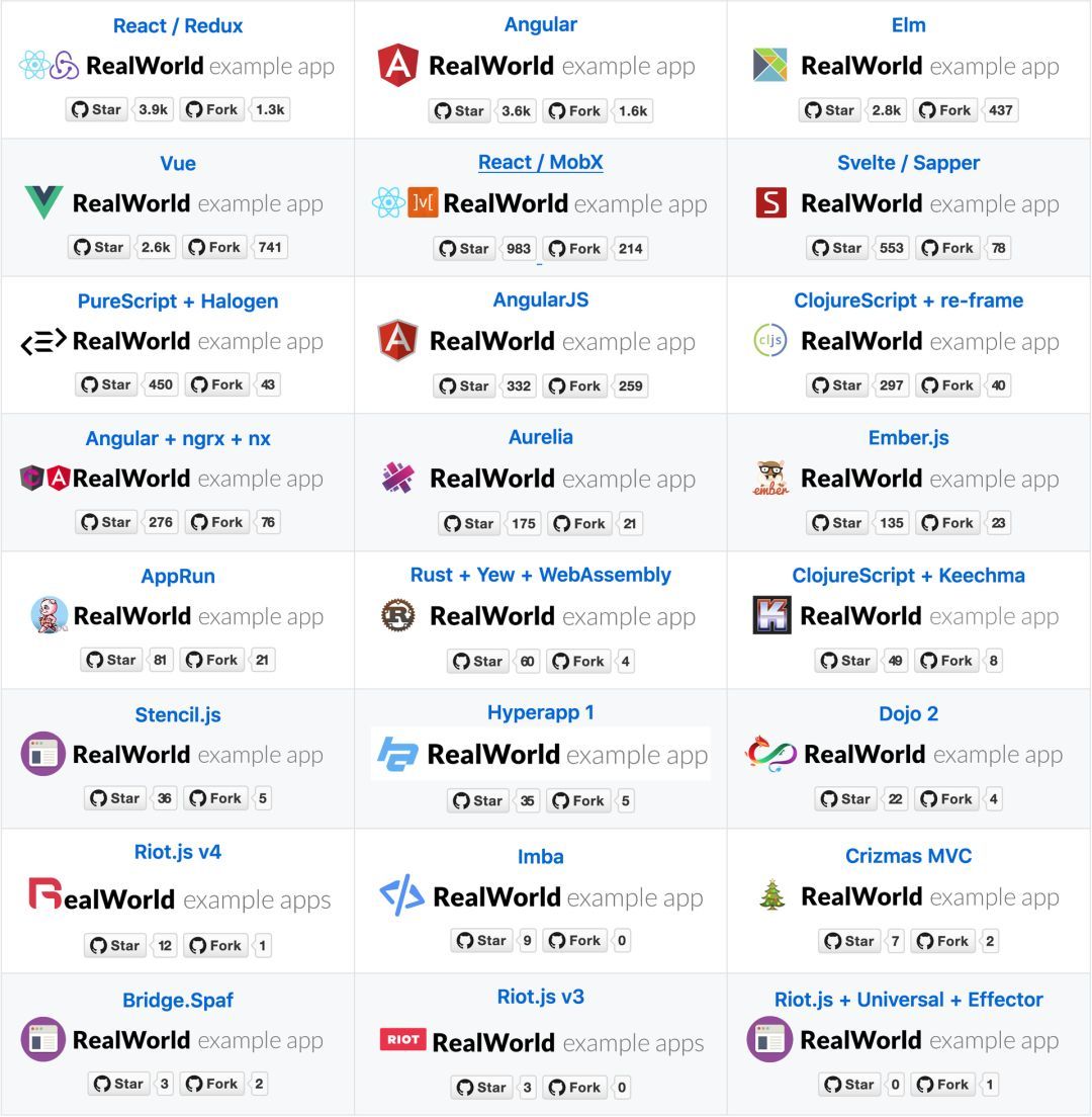 在撰写本文时(2020 年 3 月)可用的版本。这里的信息来自 RealWorld 仓库。你可以在 GitHub 存储库中找到相关数据。