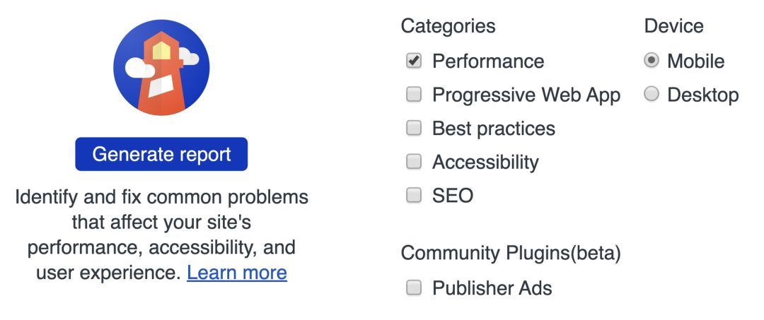 我们会检查 Chrome 随附的 Lighthouse Audit 的性能分数。Lighthouse 返回的性能分数在 0 到 100 之间。0 是最低的。更多详细信息,请参阅《Lighthouse 计分指南》。