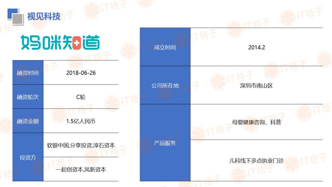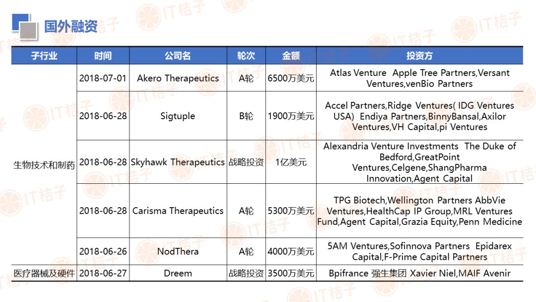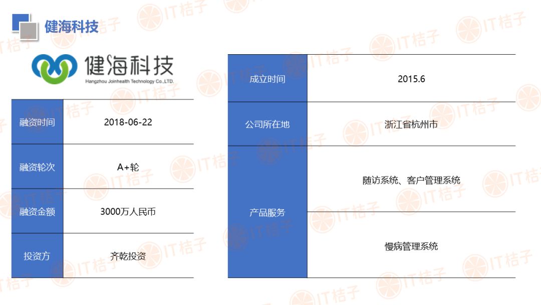 IT 桔子也顺应大健康投资热潮推出了医疗健康周报和项目拆解两个新栏目。IT 桔子医疗健康周报将从投融资动作、政策风向、业内动态等解读行业最新变化。项目拆解将从企业团队建设、产品技术、市场规模、商业模式等方面挖掘企业亮点与价值,为医疗创投提供参考。