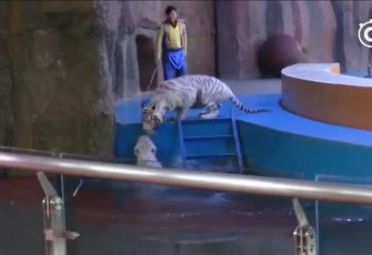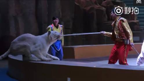 春节前期,浙江某动物园马戏表演时,一只白虎被驯兽师鞭打并逼退掉入水中,另一只白虎前去安慰,随后遭到喝令驱赶。视频流出后引发网络上极大关注。
