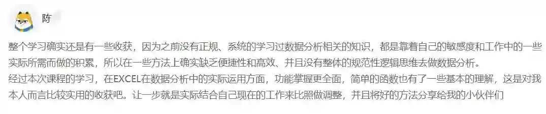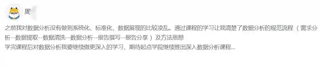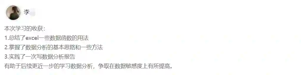 1. 学到一套完整的数据分析工作流程——解决了工作中数据量多且杂,零散抠数据、拼凑数据的问题,学会定位问题,找到数据异常的核心原因。