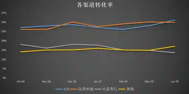 · IOS和应用市场转化率基本上没有太大的浮动,总的趋势来看是略微向好的方向发展的,但是分享有礼的渠道转化率从4月份开始不断的下降,其他渠道表现不是特别明显