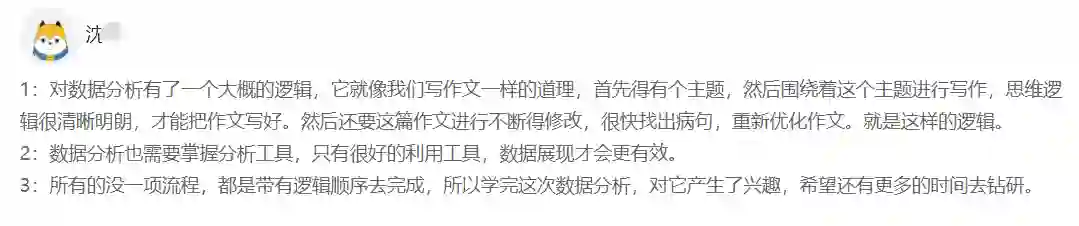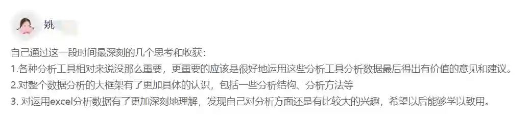 在我的软磨硬泡之下,她告诉我其实学习数据分析只用了15天,就掌握了1套完整的数据分析流程和方法。