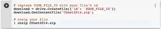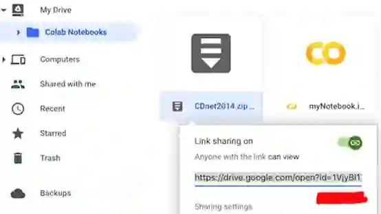另一种方法是将数据集上传到Google云端硬盘并从中进行克隆。假设您已经压缩了上面的培训集,比如说CDnet2014.zip,并上传到Google Drive中与myNotebook.ipynb相同的目录。现在,右键单击CDnet2014net.zip > 获取可共享链接。复制文件的ID并将其存储在某个地方(稍后我们将使用它)。