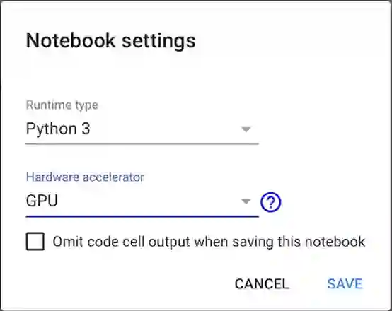 在笔记本中,选择Runtime > Change runtime type。将弹出一个窗口。然后选择您的运行时间类型,从硬件加速器下拉菜单中选择GPU并保存您的设置,如下图所示: