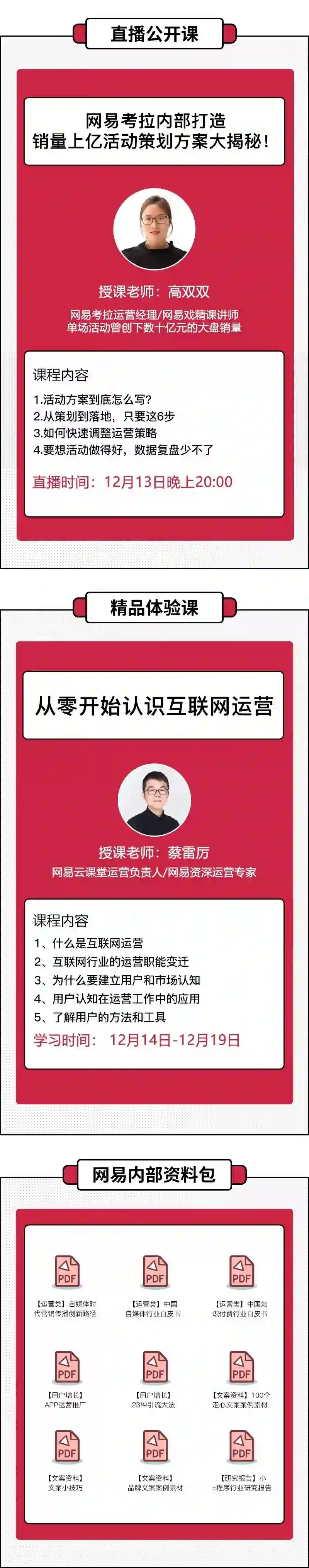 12月13日,网易云课堂安排了一场直播公开课,为想要提升运营技能的同学们答疑解惑。同时还有《互联网运营》精品体验课和《网易内部运营资料包》免费赠送。