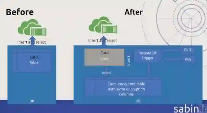 Sabin 建议考虑使用视图、触发器和存储过程等机制。它们可以更改数据库的内部结构,并同时保持向后兼容的应用数据操作。他举了一个例子,一个存储信用卡号的数据库表已经从纯文本改为被加密的,但要保证应用依然以纯文本方式检索卡号。例子中是通过查询视图实现的,而实际的数据库表通过触发器实现信息的加密和解密。处理结构如下图所示: