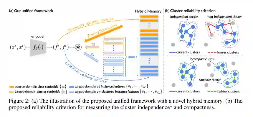 摘要:域自适应目标Re-ID旨在将学习到的知识从已标记的源域转移到未标记的目标域,以解决开放类(open-class)的重识别问题。虽然现有的基于伪标签的方法已经取得了很大的成功,但是由于域的鸿沟和聚类性能的不理想,它们并没有充分利用所有有价值的信息。为了解决这些问题,我们提出了一种新的具有混合记忆的自适应对比学习框架。混合存储器动态地生成用于学习特征表示的源域类级、目标域簇级和未聚类实例级监督信号。与传统的对比学习策略不同,该框架联合区分了源域类、目标域簇和未聚类实例。最重要的是,所提出的自适应方法逐渐产生更可靠的簇来提炼混合记忆和学习目标,这被证明是我们方法的关键。我们的方法在目标 Re-ID的多域适配任务上的性能优于现有技术,甚至在源域上不需要任何额外的标注就能提高性能。在Market1501和MSMT17数据上,我们的无监督目标Re-ID的通用版本分别比最先进的算法高出16.7%和7.9%。