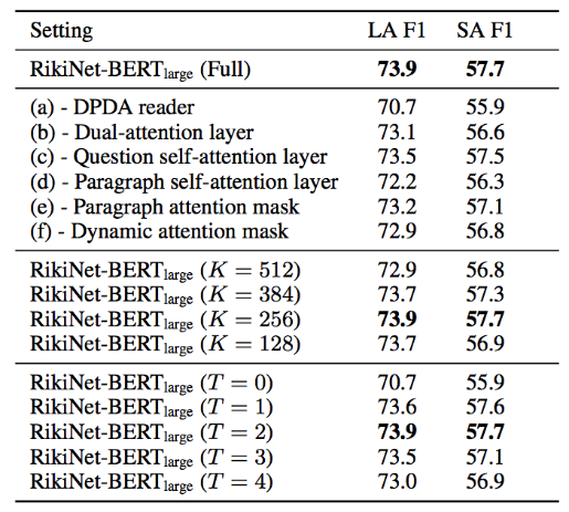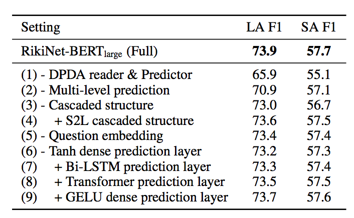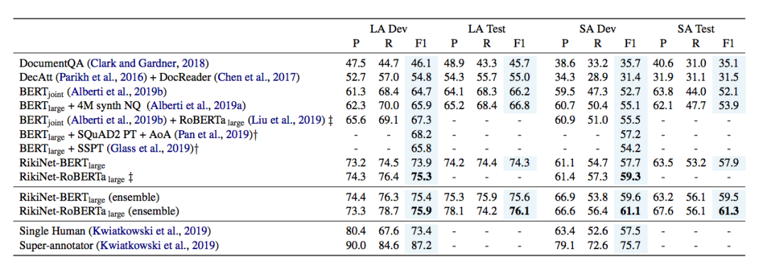 我们将基于 BERT 和 RoBERTa 的 RikiNet 模型与之前的模型进行比较,包括 IBM AI,Google AI 在 NQ 任务上提出的模型。如表7所示,我们的单模型首次在长答案(LA)和短答案(SA)的 F1 分数上超过单人类,并且集成模型在提交时取得了 NQ leaderboard 双指标第一名。